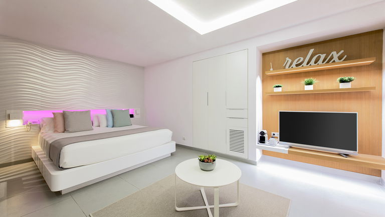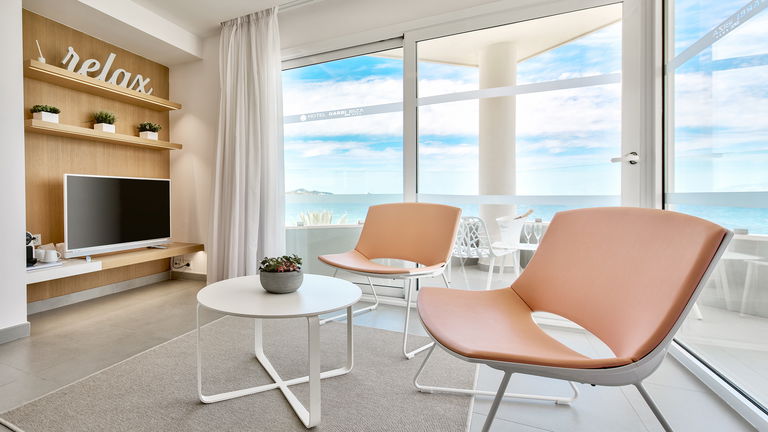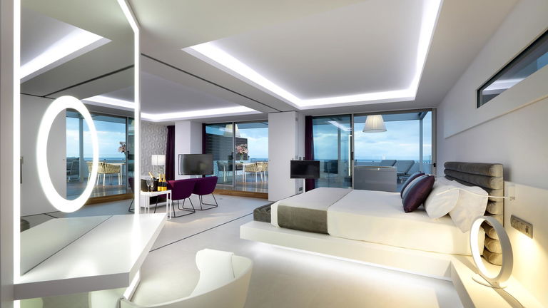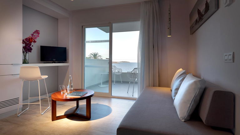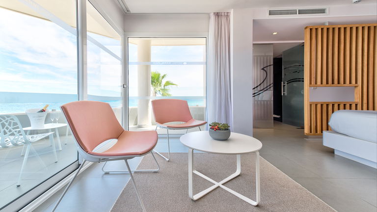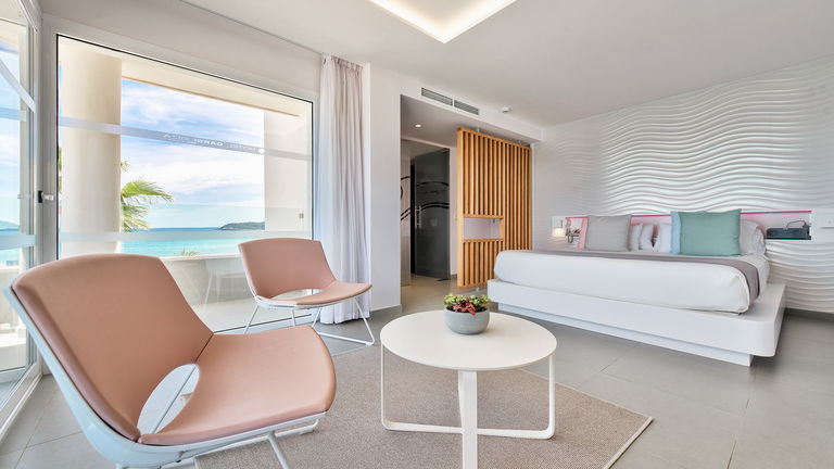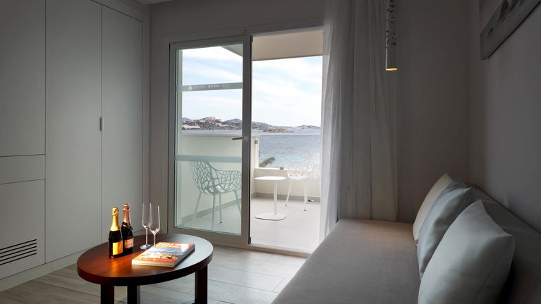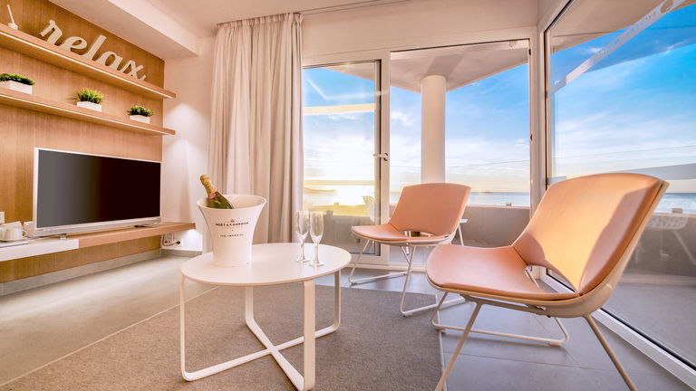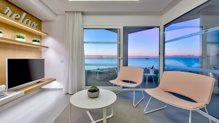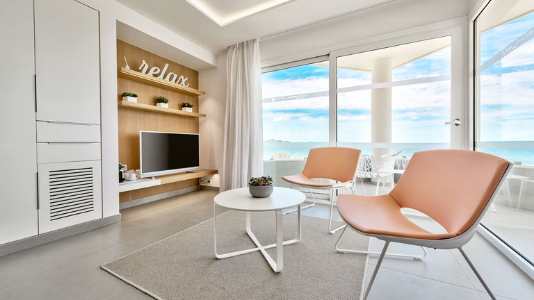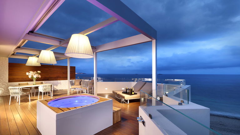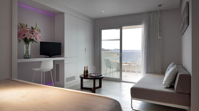 Spaziose suite rinnovate di recente con 48 m² con vista laterale sul mare, luci a LED per cromoterapia, aromaterapia, TV LCD, WiFi gratuito, aria condizionata, mini frigo, cassaforte gratuita in camera, asciugacapelli e terrazza o balcone.