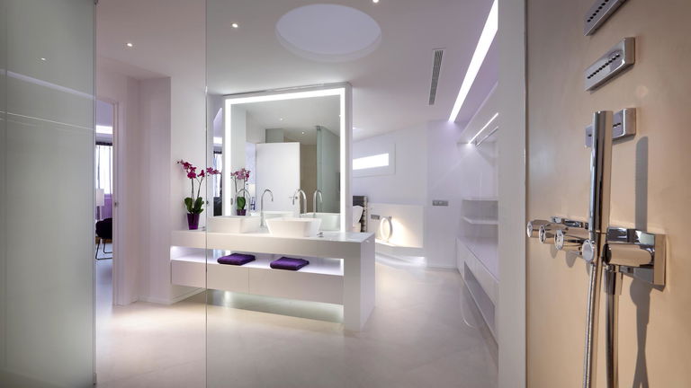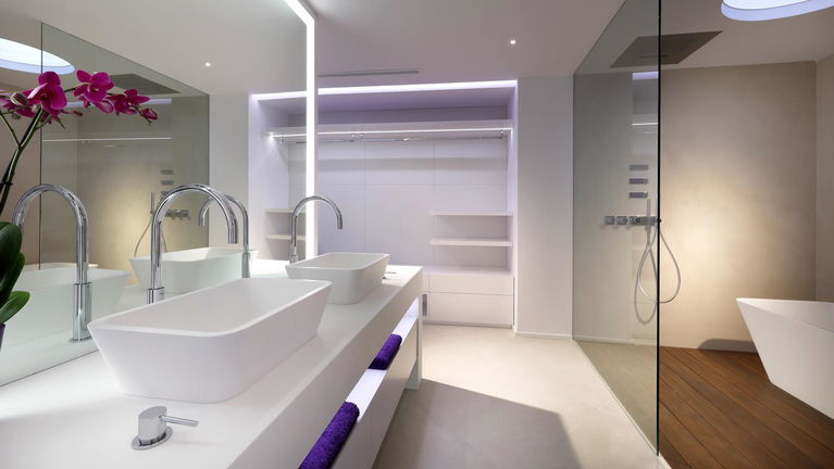 Bagno grande illuminato con luci led con vasca e doccia a pioggia.