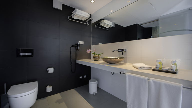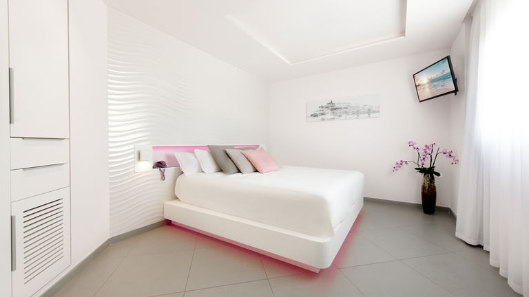 Camere spaziose recentemente rinnovate con vista mare, letto matrimoniale, con cromoterapia a LED, kit per aromaterapia, TV LCD, WiFi gratuito, aria condizionata, frigorifero, cassaforte gratuita in camera, asciugacapelli e terrazza o balcone.